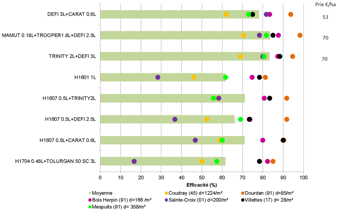 – H1607 0,5 l + Trinity 2 l (500 g de chlortoluron, 80 g de DFF et 600 g de pendimethaline) et H1607 0,5 l + Carat 0,6 l (150 g de flurtamone et 60 g de DFF) atteignent 71 % en moyenne, soit un gain de 10 points par rapport aux apports de picolinafen ou de chlortoluron. Ces associations restent cependant en retrait, notamment par rapport à Défi + Carat.