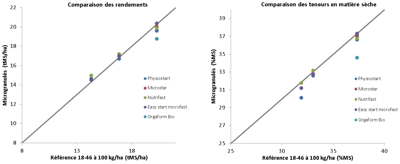 Figure 2 : Résultats des microgranulés en comparaison à du 18-46 à 100 kg/ha et localisé à 5-5 cm (3 essais maïs fourrage ARVALIS entre 2014 et 2015)