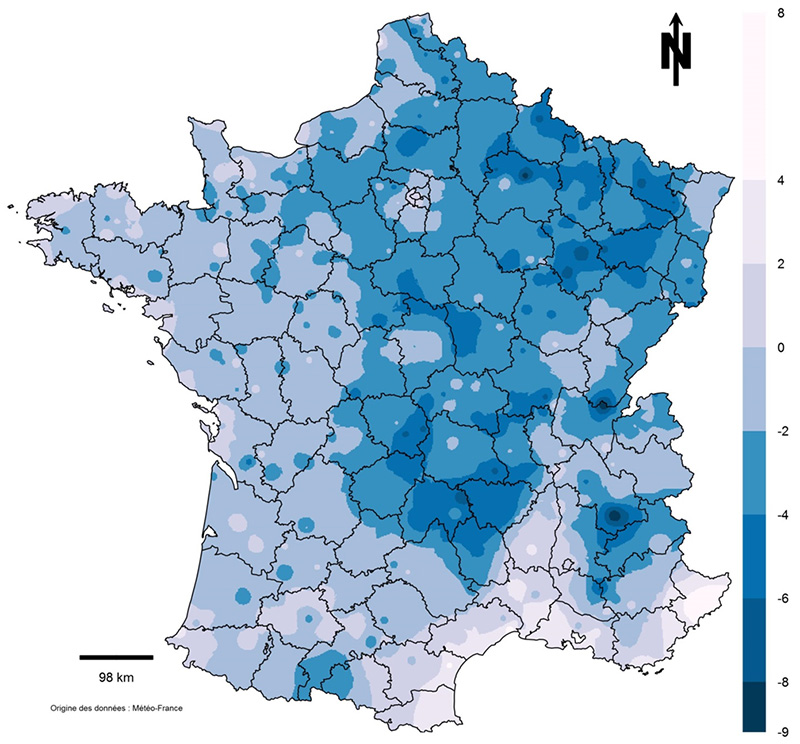 Les températures minimales ont été enregistrées entre le 20/04/2017 et le 26/04/2017. Les plus basses températures enregistrées sont de l’ordre de – 4°C sur la toute la région Normandie.