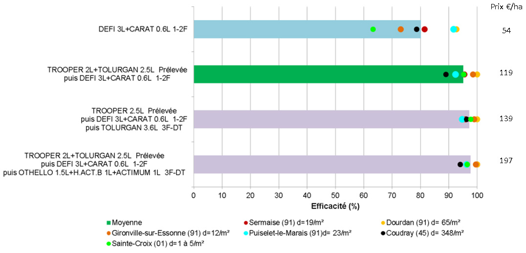 Figure 5 : Efficacité des applications en programme (prélevée puis postlevée 1-2 F puis 3 F de l’orge) (essai vulpin 2016 à Marandeuil) d = 300 à 400/m2 – Prix d’ordre indicatif
