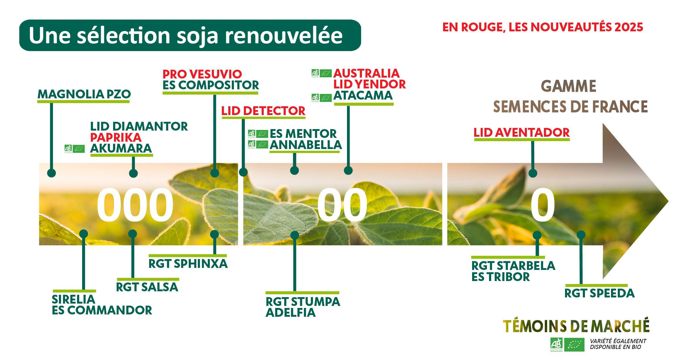 En groupe 00 ATACAMA est notre valeur sûre reconnue pour sa régularité. ANNABELLA vient compléter la gamme dans ce groupe en apportant précocité et productivité (N°1 dans le réseau TERRES INOVIA 2023 et 2024 !). ES COMPOSITOR reste notre assurance productivité en fin de groupe 000. Sans oublier ES MENTOR, un incontournable sur le marché du soja